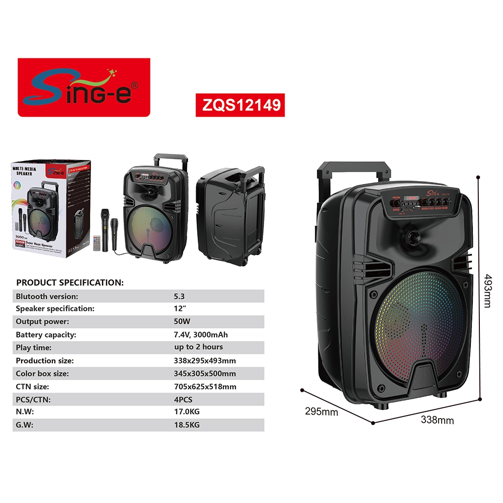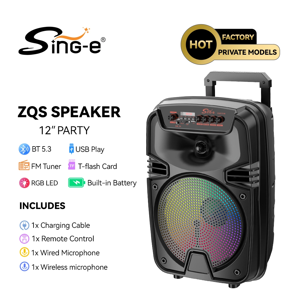 SING-E ZQS12149 menggabungkan a 12-Woofer inci, Bluetooth 5.3, Pertunjukan cahaya RGB, dan keduanya nirkabel & mikrofon berkabel